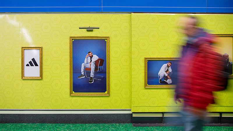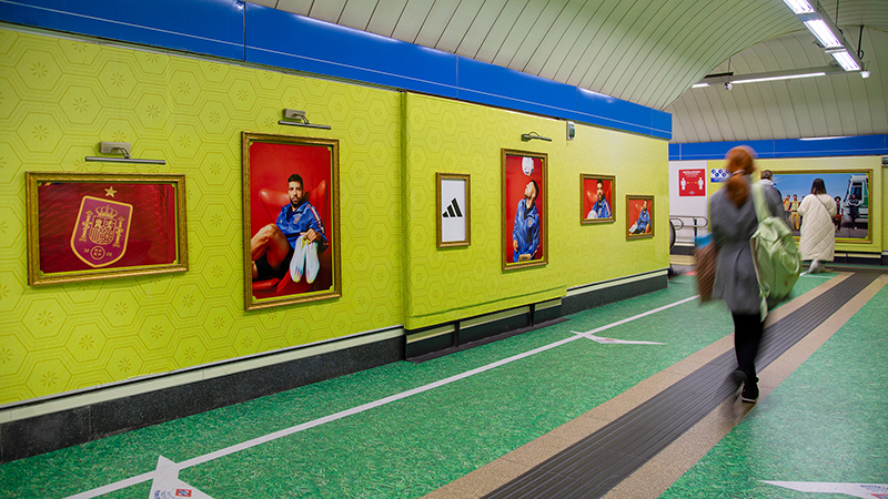 Adidas transforma el metro de Madrid con paredes amarillas y cuadros llamativos que protagonizan a una variedad de jugadores de fútbol famosos.