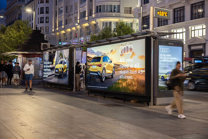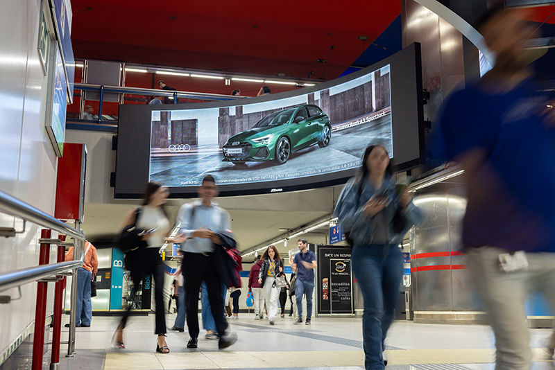 Para el lanzamiento del nuevo Audi A3 Sportback, la marca decidió apostar por una campaña 360º en todos nuestros soportes digitales: calle, metro, centros comerciales y Gran Formato Gran Vía. Utilizando el efecto 3D para destacar el coche.