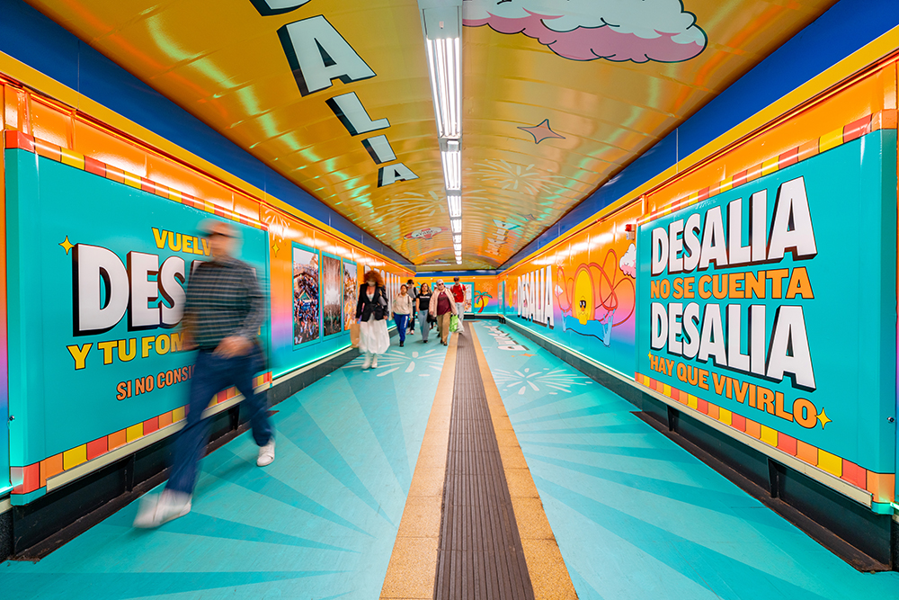 Campaña de Desalia con una pantalla de gran tamaño, vinilado completo en los pisos y paredes y un DJ en el metro de Callao en Madrid.