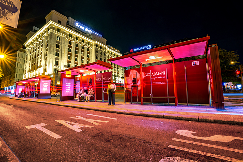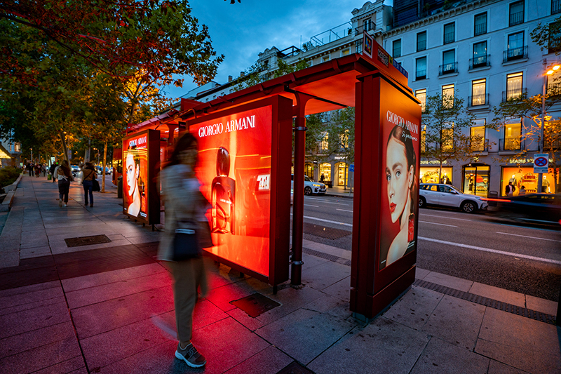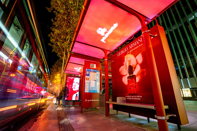Giorgio Armani estrena nuestro Gran Formato Serrano con pantalla y metacrilato impreso retroiluminado y añade a su Dominación Milla de Oro iluminación dinámica en los techos de las marquesinas que “palpitan” al ritmo de su Sí Passione.