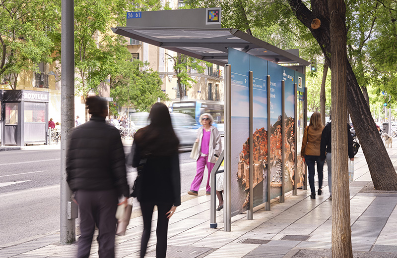 Marquesina totalmente vinilada, con un mupi interactivo de Iberia, el cual recomienda lugares para viajes.