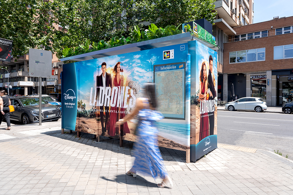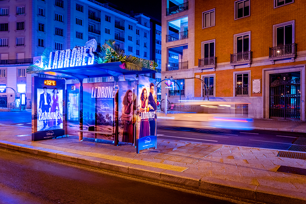 Marquesina totalmente vinilada de la nueva serie en Disney+, "Ladrones", con corpóreos en techo e iluminación.