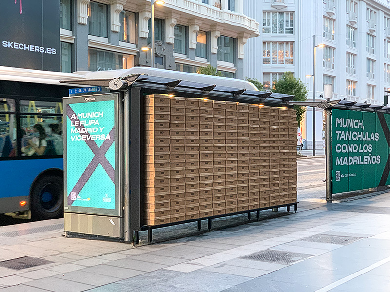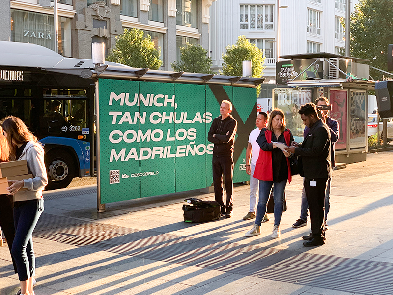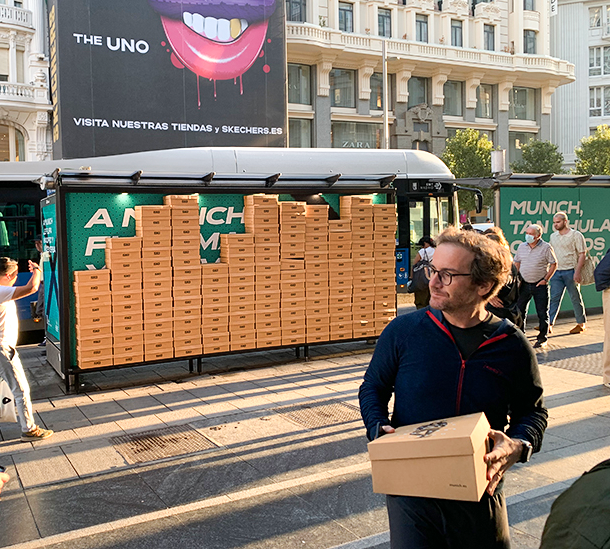 Munich Sports aprovecha el Gran Formato Gran Vía como estrategia de street marketing. La marca regalaba zapatillas entregando una sola y redirigiendo a las personas a su tienda para conseguir la pareja.