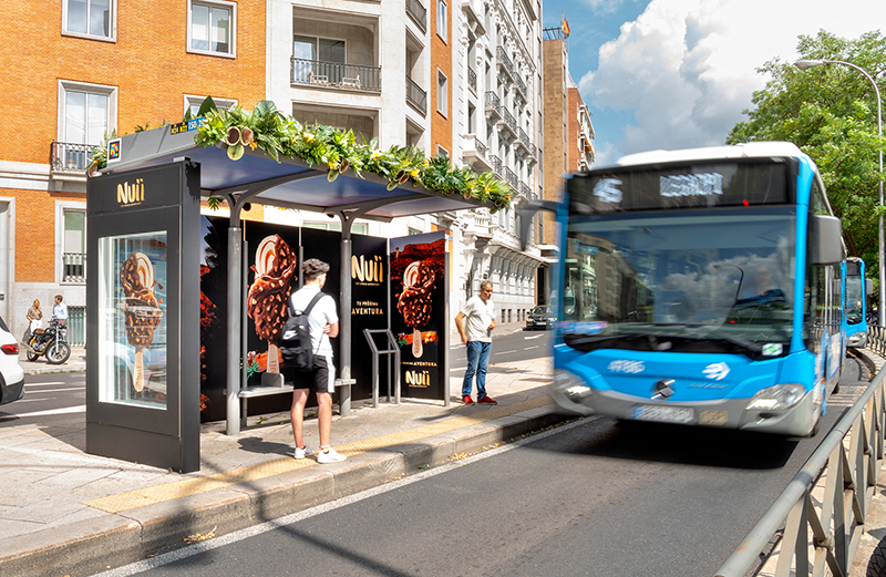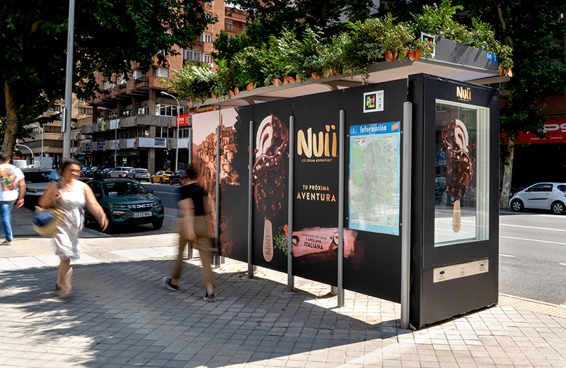 NUII presenta su nueva campaña utilizando vinilado integral de la marquesina y un mupi transparente para demostrar su nuevo producto