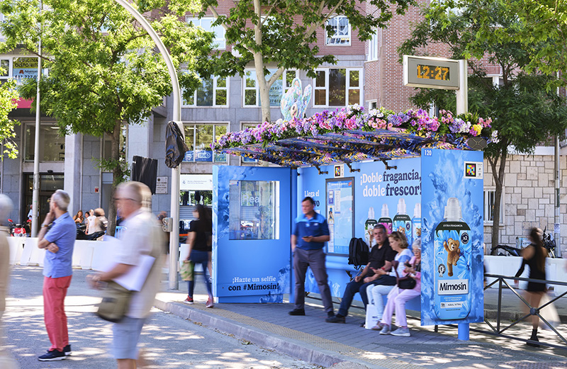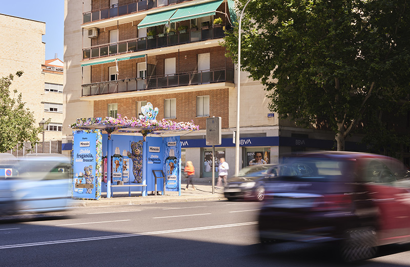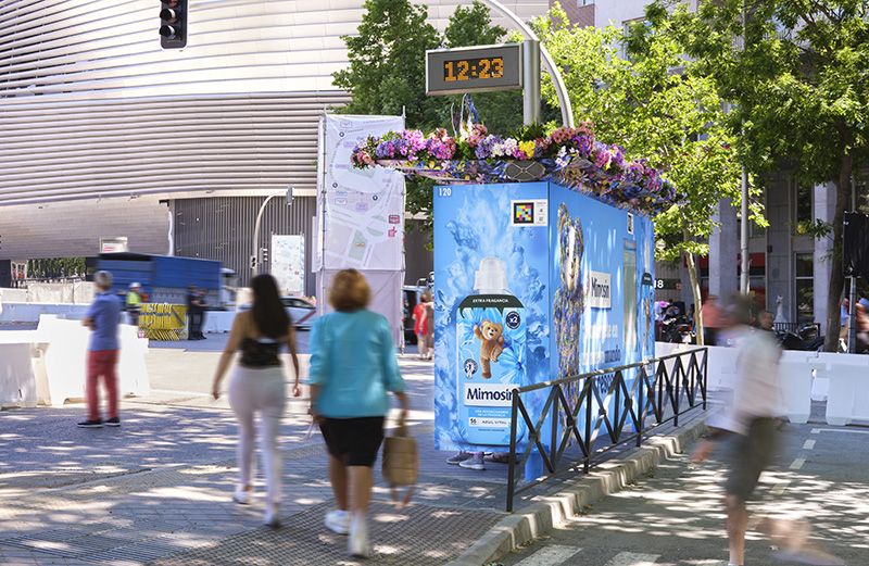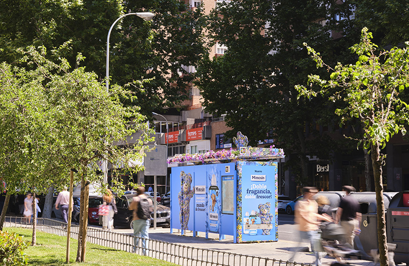 Mimosín llena de flores las calles de Madrid con jardines en los techos, corpóreos del osito y escaparates con pétalos volando