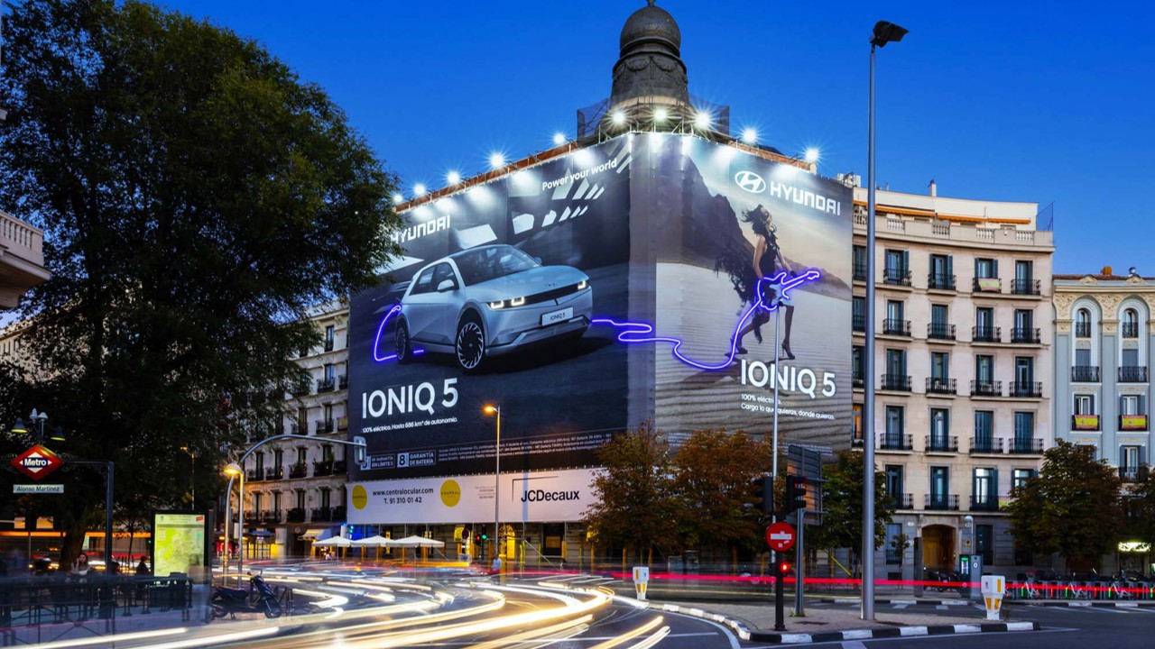 Hyundai lanzó el IQONIQ 5 con una lona en Plaza de Almagro bajo el concepto "Power your World". Destacando la carga innovadora que permite enchufar cualquier dispositivo en cualquier lugar.