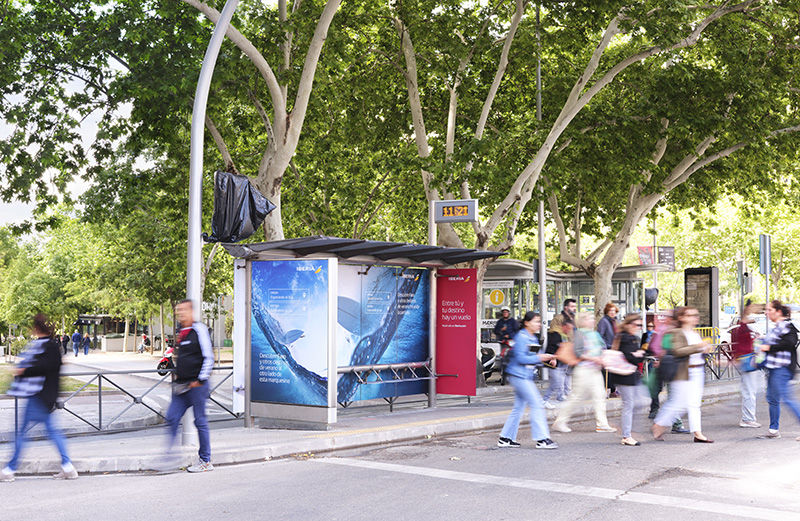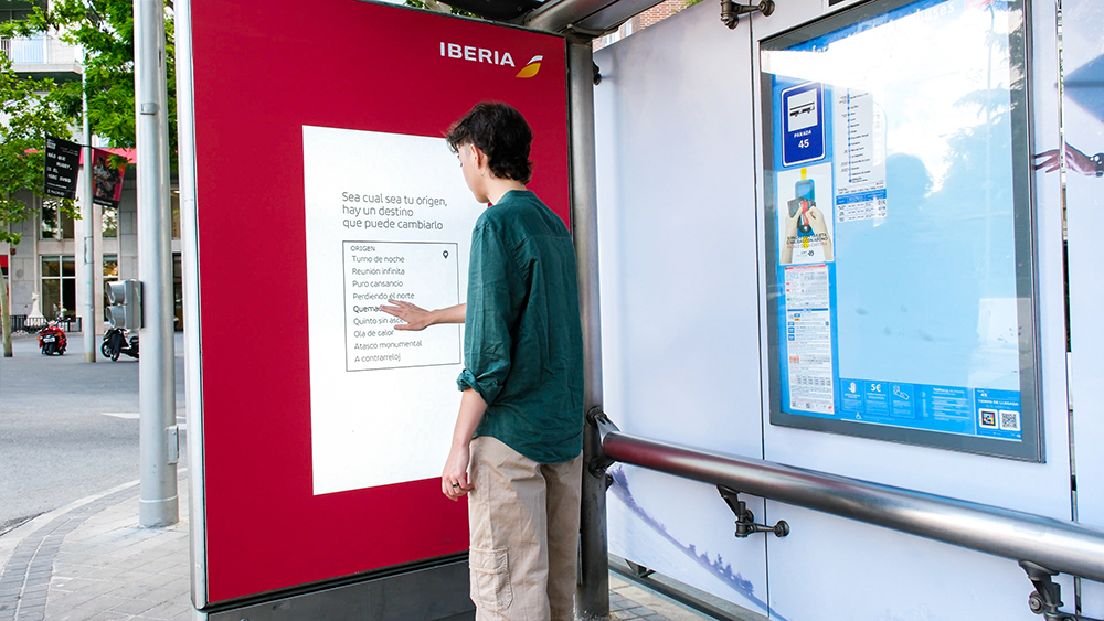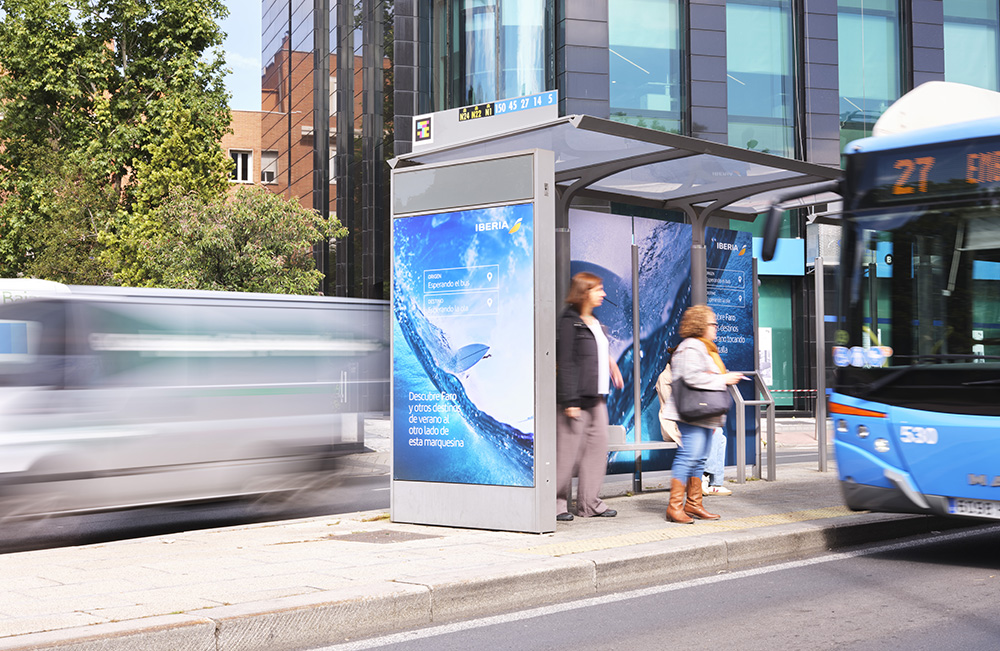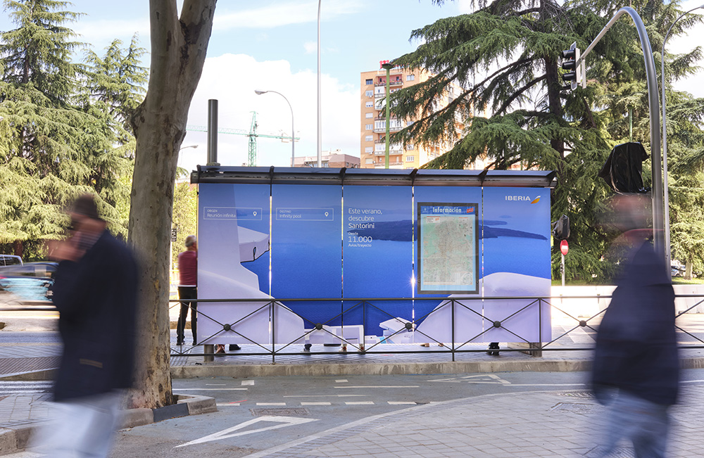 Marquesina totalmente vinilada, con un mupi interactivo de Iberia, el cual recomienda lugares para viajes.