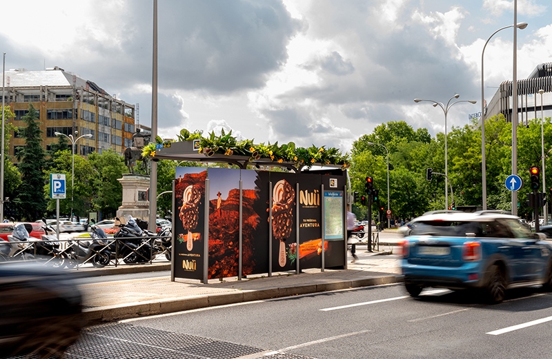 NUII presenta su nueva campaña utilizando vinilado integral de la marquesina y un mupi transparente para demostrar su nuevo producto