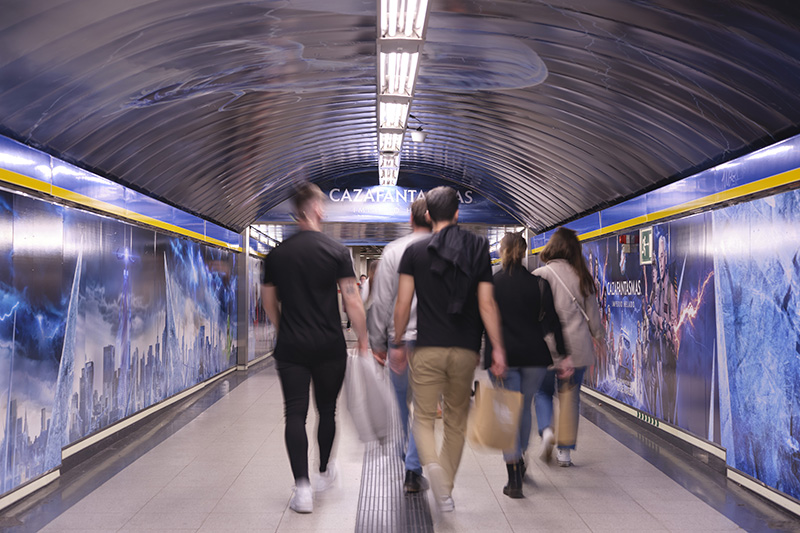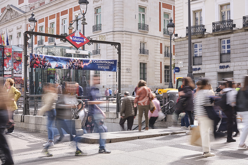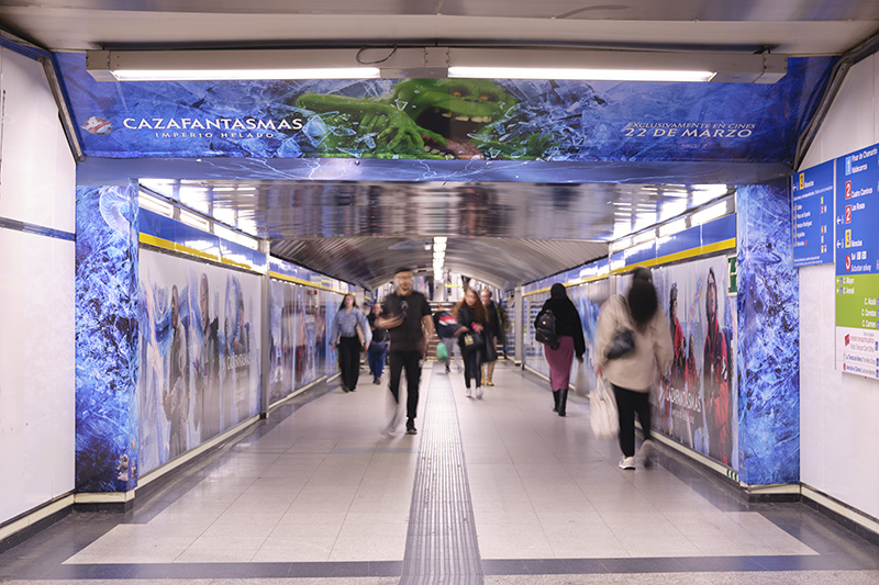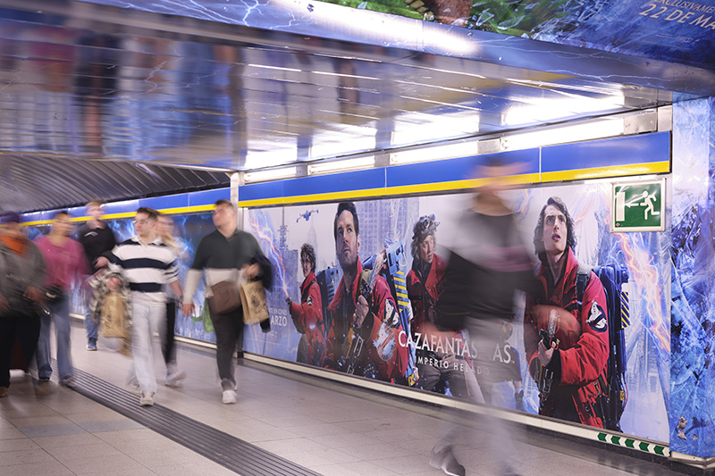 Sony Pictures personaliza el metro de Madrid con marketing para el estreno de su nueva película de la saga de Cazafantasmas. Utilizan el clásico logotipo del metro para traer a vida a su fantasma más emblemático.