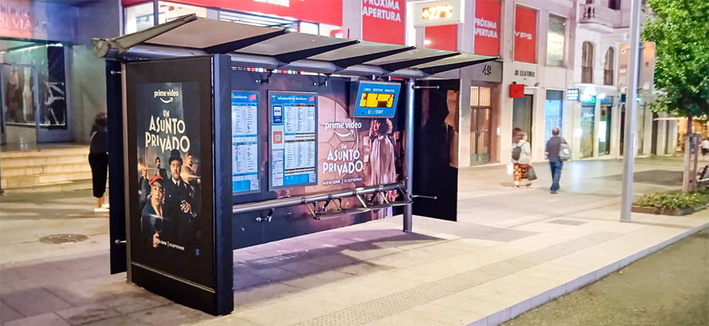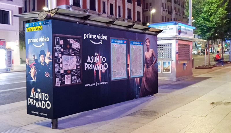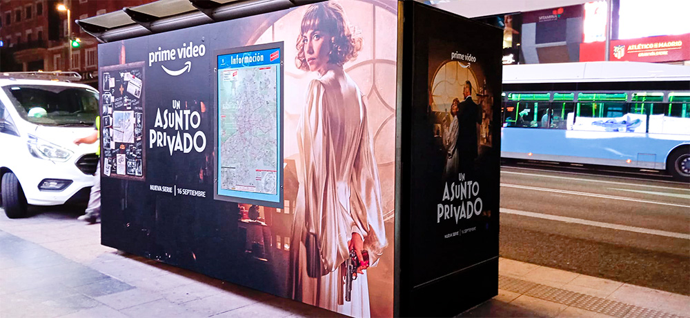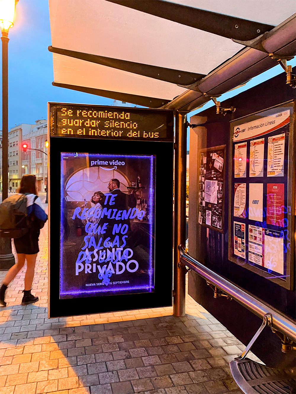 Marquesina vinilada integral que esconde un mensaje durante el día y lo revela con luz negra por la noche.