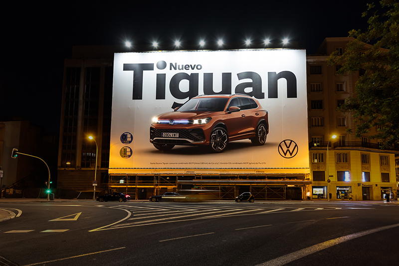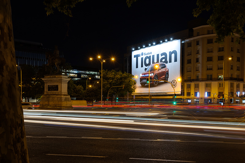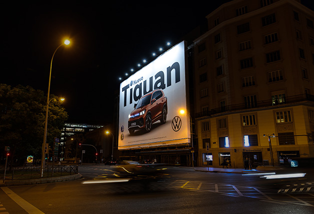 Volskwagen presenta su nuevo modelo Tiguan utilizando una lona con luces leds en el coche.