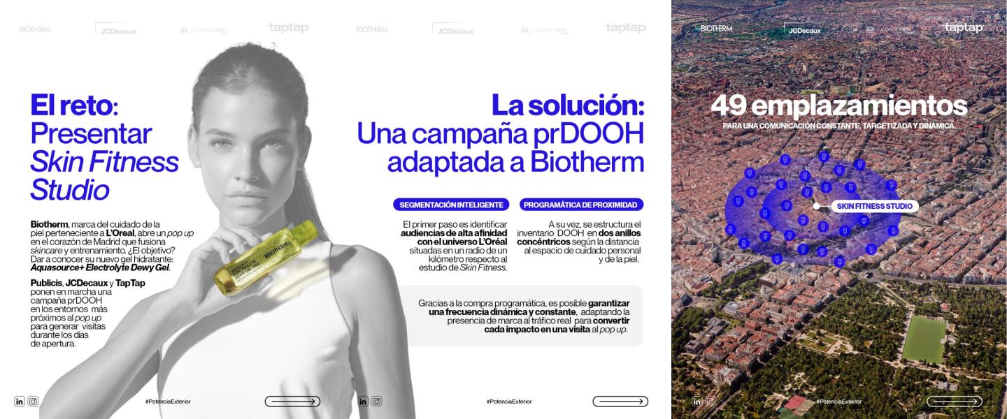 Biotherm, la marca del cuidado de la piel perteneciente a L'Oreal, quiere dar a conocer su nuevo gel hidrantante Aquasource+ Electrolyte Dewy Gel. Para lograrlo, la marca creó el Skin Fitness Studio, un pop-up en el corazón de Madrid que fusiona el cuidado de la piel con el entrenamiento. Más allá de la experiencia física, la marca apostó por una campaña de publicidad programática para maximizar el tráfico al lugar.